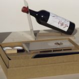 Este delicado expositor de botellas, cuenta además con un exquisito diseño de packaging en el que se conjuga a la perfección unión, mezcla, materiales, experiencias, sentidos, sabores y sensaciones. El expositor es una estructura fabricada a mano compuesta por dos partes diferenciadas: la base y el mástil. La base es de madera de nogal español y el mástil es chapa de acero inoxidable. Ambas unidas a través de una bisagra metálica de libro, para que pueda plegarse cómodamente y sin ocupar espacio.
