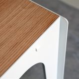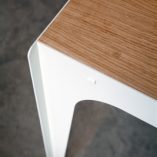 Esta mesa de acero y madera de cuatro patas está disponible con la estructura metálica en dos colores. Blanca y anodizada sin lacar. Su tablero es de madera y está enrasado con el cajón realizado en chapa de acero. Sus patas son perfiles en “L” asimétricas, que cuando llegan al suelo se han unificado en un único elemento.