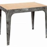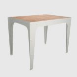 Mesa de acero y sin soldaduras con tablero de madera. Esta mesa surge como homenaje a los antiguos juguetes de hojalata y su forma de ensamblaje.